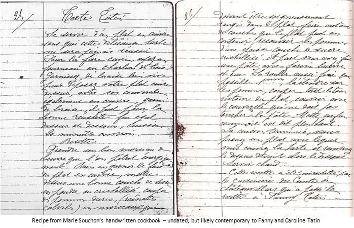 Another contemporary account comes from the unpublished hand-written notes of Marie Souchon, a close friend of the sisters, who lived nearby. It gives us the first recorded recipe. Although undated, it likely reflects the author's first-hand observations in the hotel kitchen: