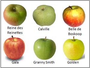 Gala, Golden, Granny Smith, and sometimes Belle de Boskoop, a Dutch variety. My own preference is for native apples. Each region has them, and they are well worth